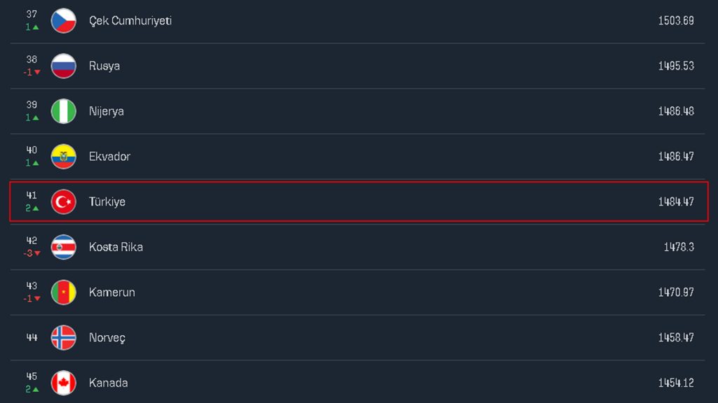 2022 FIFA Dünya Kupası şampiyonu Arjantin, bin 843,73 puanla zirvedeki yerini korurken, son Dünya Kupası finalisti Fransa bin 843,54 puanla 2. sırada, bin 828 puanlı Brezilya ise 3. basamakta yer aldı. Puanını bin 797 yapan İngiltere, 4. sıraya yükselirken, bin 788 puanlı Belçika, 5. sıraya geriledi.